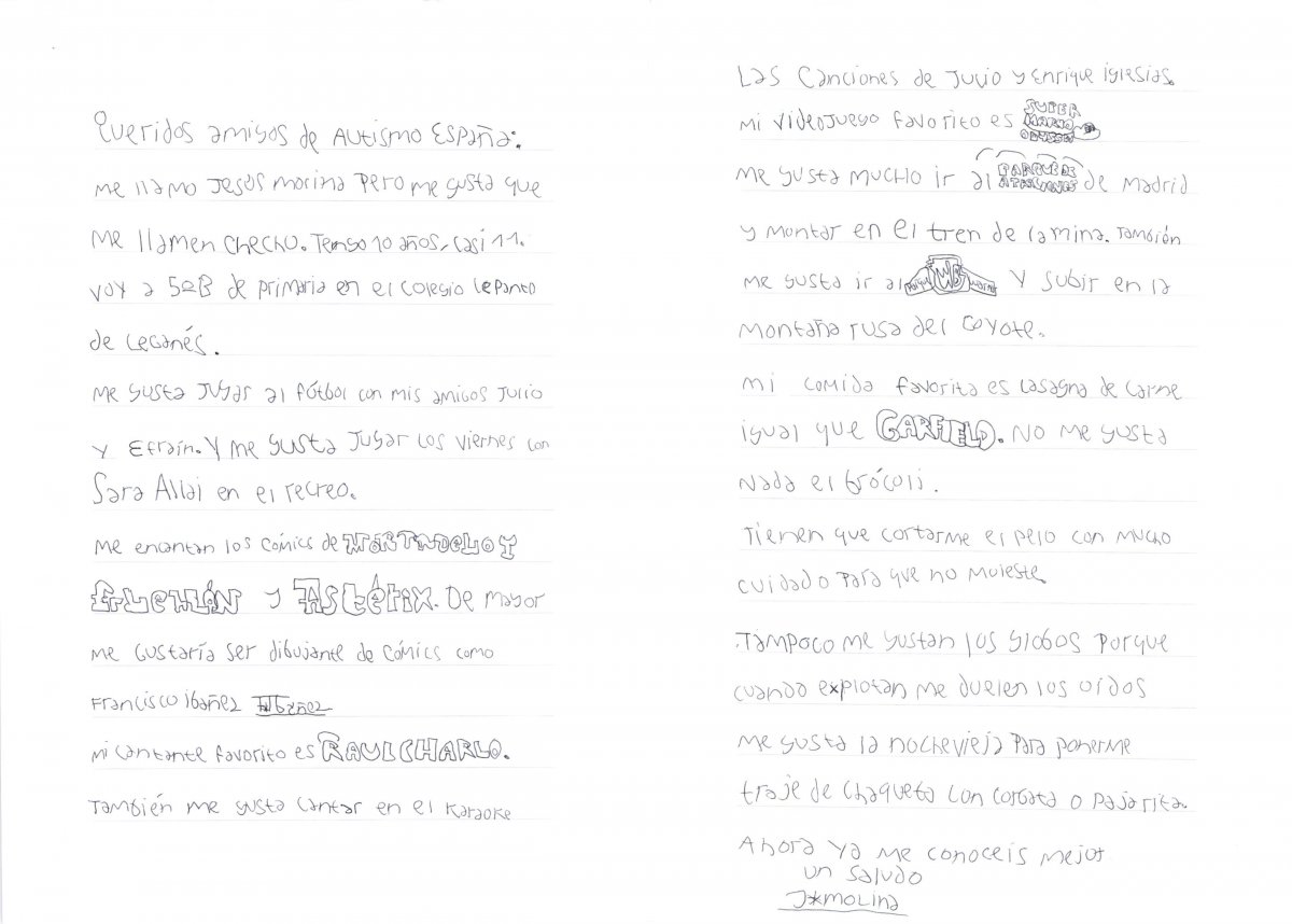 Inauguramos el blog con una preciosa carta que nos ha enviado Jesús (Chechu), un niño con TEA: